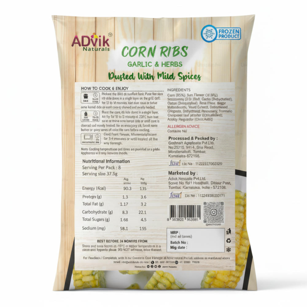 Enjoy the irresistible taste of Sweet Corn Ribs coated with aromatic garlic and herbs. Made from carefully selected premium sweet corn, each rib is cut to perfection and seasoned with a flavorful blend of garlic and herbs to deliver a delicious balance of natural sweetness and savory taste in every bite.